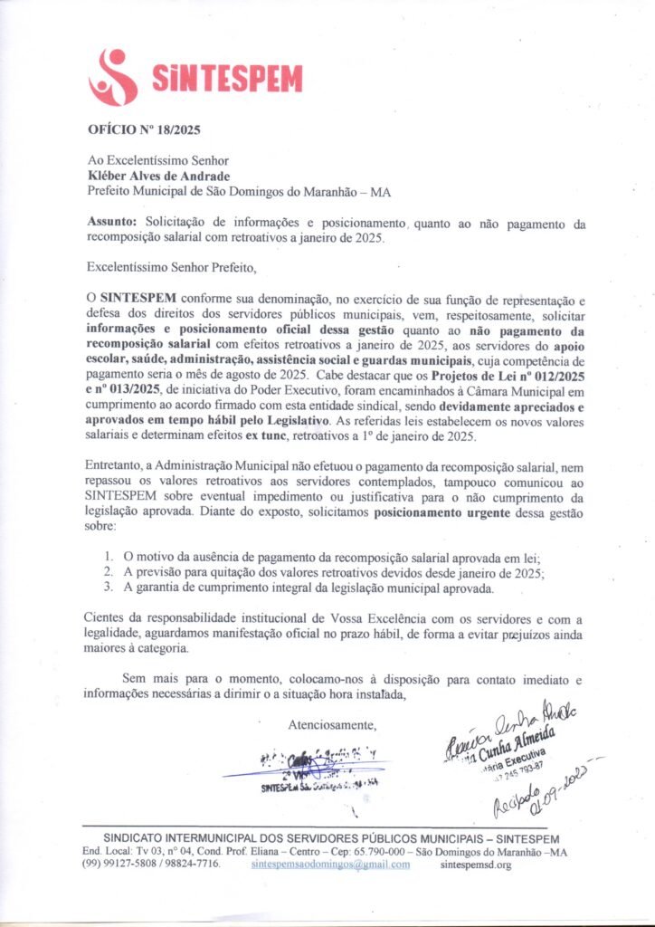 O SINTESPEM – protocolou ofício junto à Prefeitura Municipal na manhã desta segunda primeiro de setembro, solicitando informações e posicionamento oficial sobre o não cumprimento do pagamento da recomposição salarial dos servidores do apoio escolar, saúde, administração, assistência social e guardas municipais, cuja competência seria agosto de 2025. O documento, assinado pelo presidente da entidade, Valmir Carlos de Araújo Júnior, foi encaminhado também à assessoria jurídica do gestor municipal.